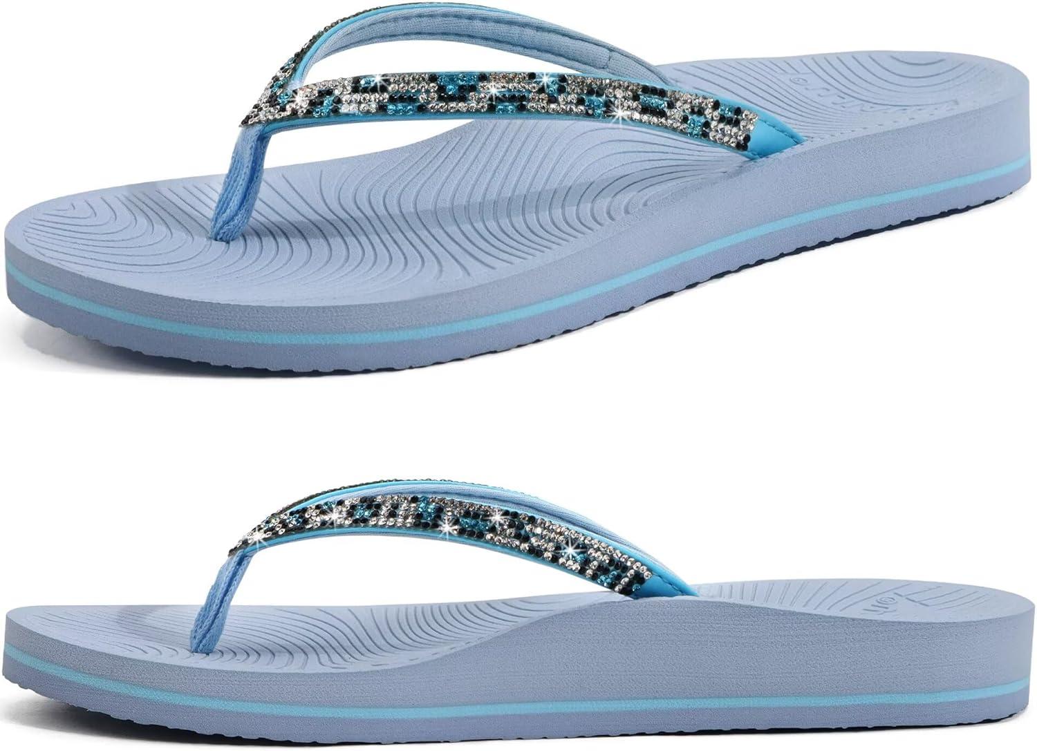 KuaiLu Women’s Rhinestone Flip Flops with Comfort Arch Support Yoga Mat Cushion Sandals Fashion Summer Beach Travel Orthotic Walking Thong Sandles Slip on Plantar Fasciitis Indoor Outdoor Shoes(Light Blue)