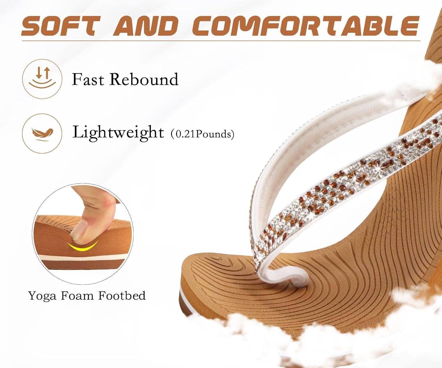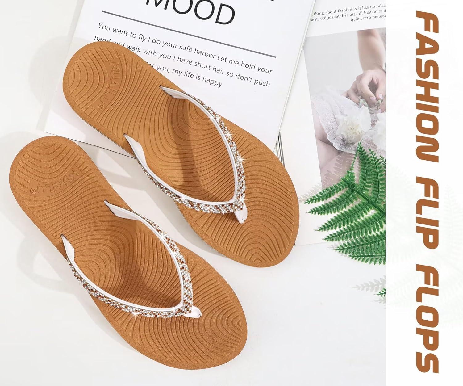imageKuaiLu Womens Rhinestone Flip Flops with Comfort Arch Support Yoga Mat Cushion Sandals Fashion Summer Beach Travel Orthotic Walking Thong Sandles Slip on Plantar Fasciitis Indoor Outdoor ShoesWhite Khaki
