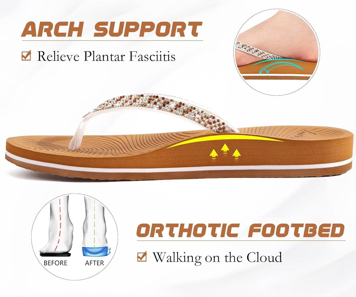 imageKuaiLu Womens Rhinestone Flip Flops with Comfort Arch Support Yoga Mat Cushion Sandals Fashion Summer Beach Travel Orthotic Walking Thong Sandles Slip on Plantar Fasciitis Indoor Outdoor ShoesBrown