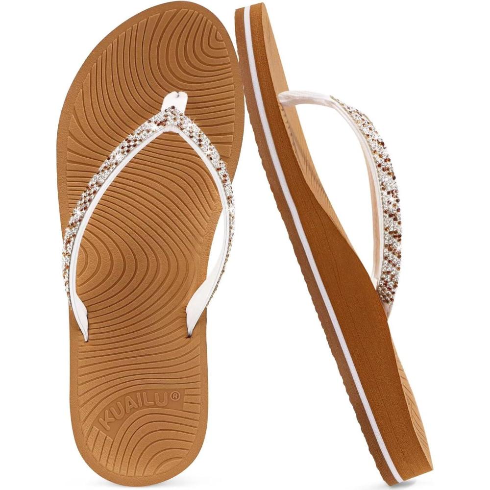 KuaiLu Women’s Rhinestone Flip Flops with Comfort Arch Support Yoga Mat Cushion Sandals Fashion Summer Beach Travel Orthotic Walking Thong Sandles Slip on Plantar Fasciitis Indoor Outdoor Shoes(White Khaki)