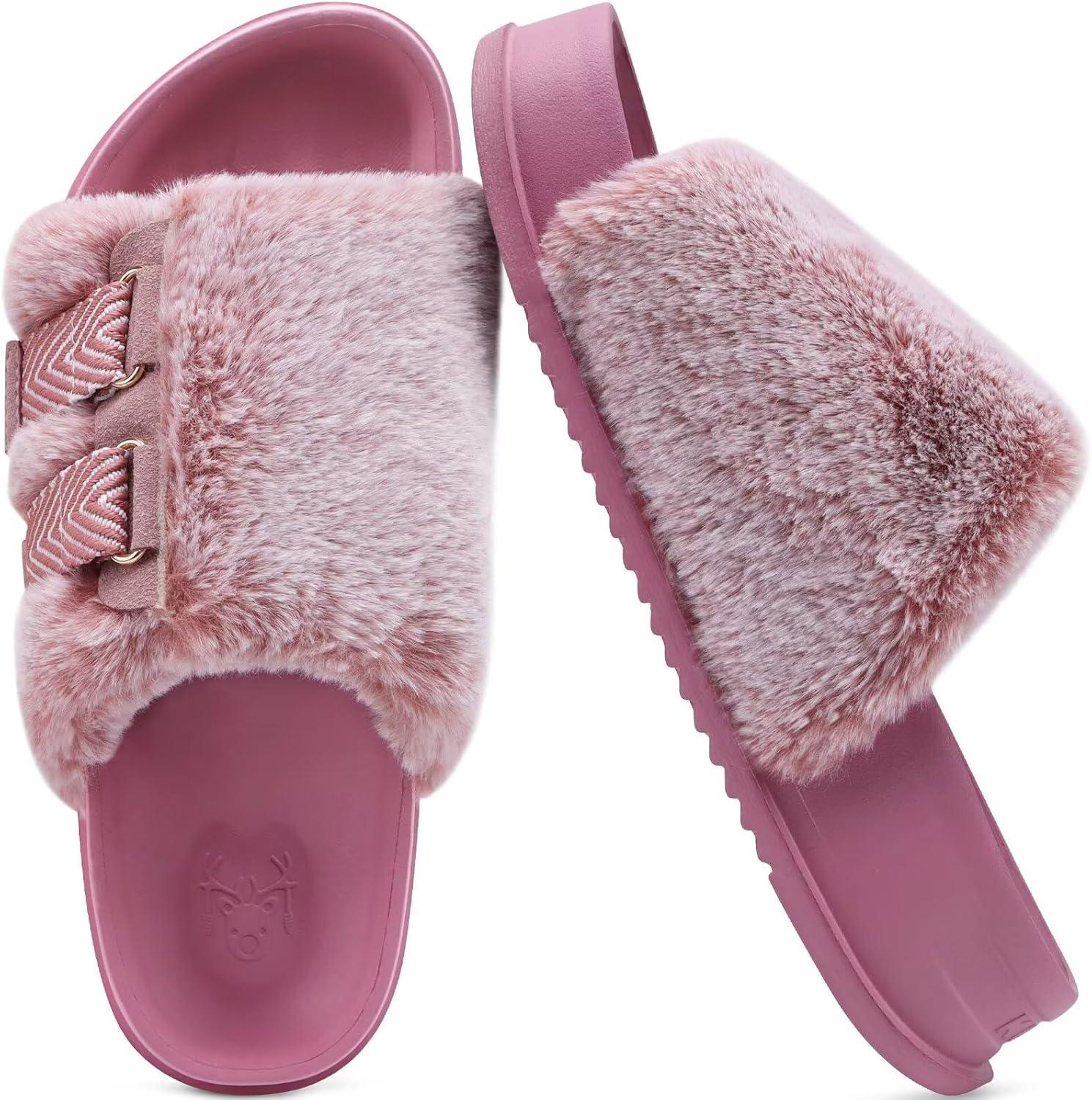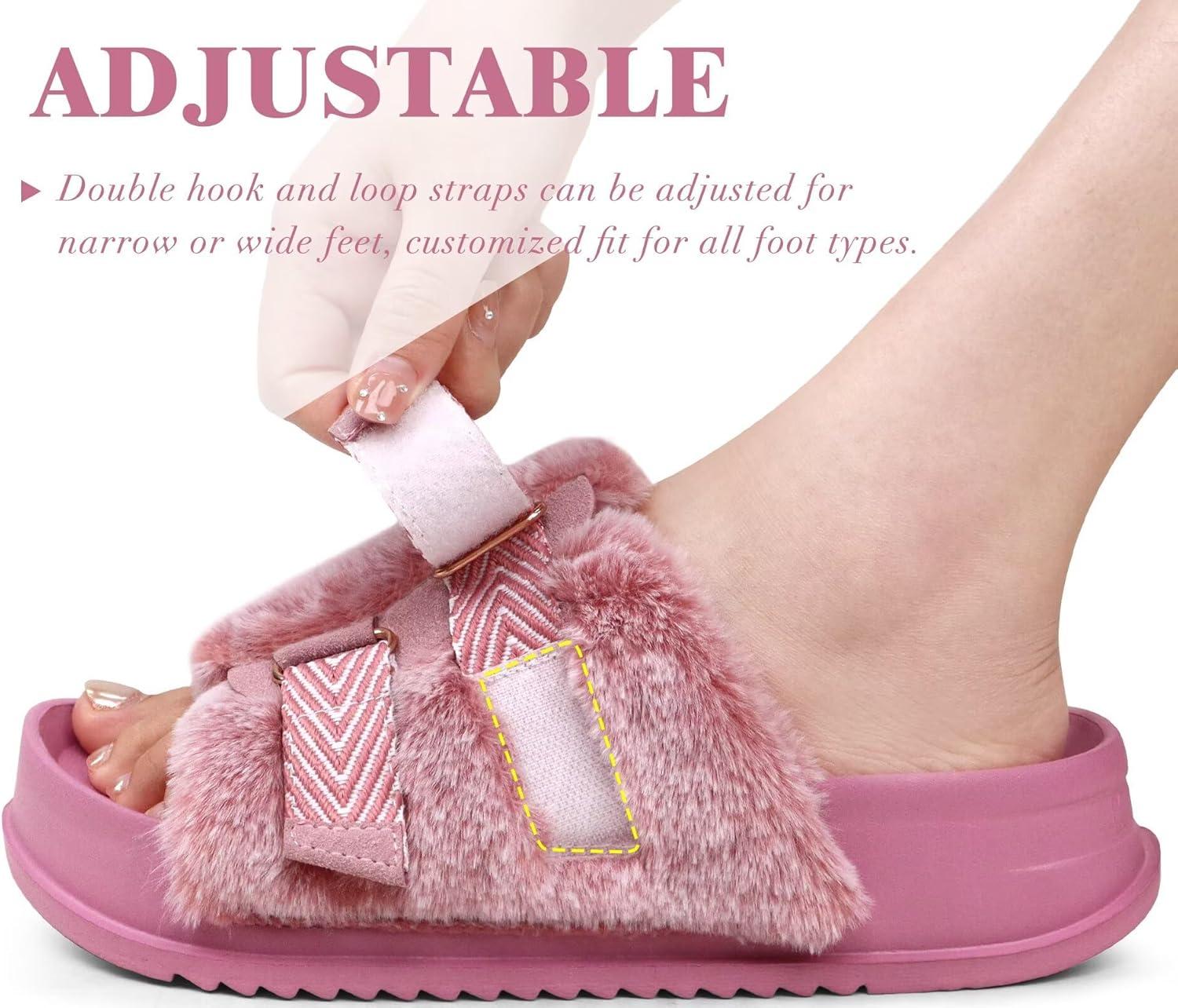 KuaiLu Womens Orthotic Sandals Comfortable Arch Support Faux Fur Sandal Slippers Casual Summer Adjustable Cushion Slides Slip On Indoor Outdoor House Shoes